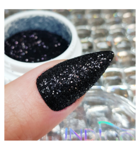 O efeito Black Snow XL é um pó de unhas com partículas maiores que o efeito Black Snow, que cria um efeito de açúcar nas unhas.