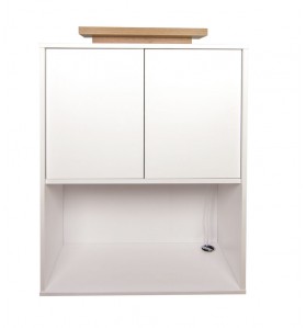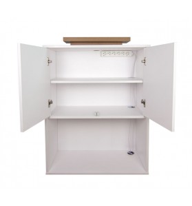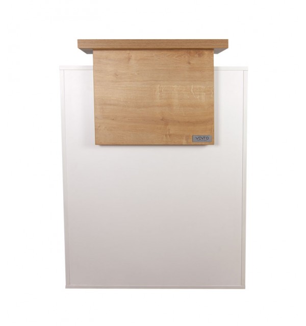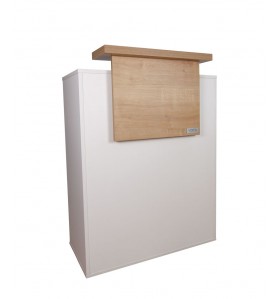 No lado de trabalho, o balcão de receção tem duas prateleiras fundas, uma das quais é fechada e tem uma prateleira adicional interna e 5 tomadas para ligar um carregador, computador portátil, caixa registadora ou outros dispositivos necessários.
